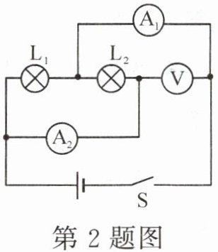 2. 如图所示的电路中,灯泡 $ L_1 $ 和 $ L_2 $ ______ (填“串联”或“并联”),开关 $ S $ 闭合时,电流表 $ A_1 $ 和 $ A_2 $ 的示数分别是 $ 0.5 \, A $ 和 $ 0.3 \, A $,电压表 $ V $ 的示数为 $ 2.5 \, V $,则通过 $ L_1 $ 的电流为 $ A $,通过 $ L_2 $ 的电流为 $ A $,电源电压为 $ V $。