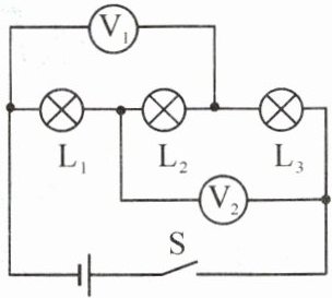 3. 如图所示,已知电源电压为 $ 10 \, V $。闭合开关后,电压表 $ V_1 $ 示数为 $ 8 \, V $,电压表 $ V_2 $ 示数为 $ 7 \, V $,则 $ L_1 $、$ L_2 $、$ L_3 $ 两端的电压依次为 ( )