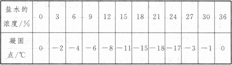 ℃;②他们发现所测得盐水的凝固点并不相同,于是对比了双方实验过程,发现烧杯中装水都是200 mL,小明加了一汤匙的盐,而小红加了3汤匙的盐,由此做出猜想:盐水的凝固点与盐水的浓度有关。接着多次实验得出不同浓度盐水的凝固点如表;