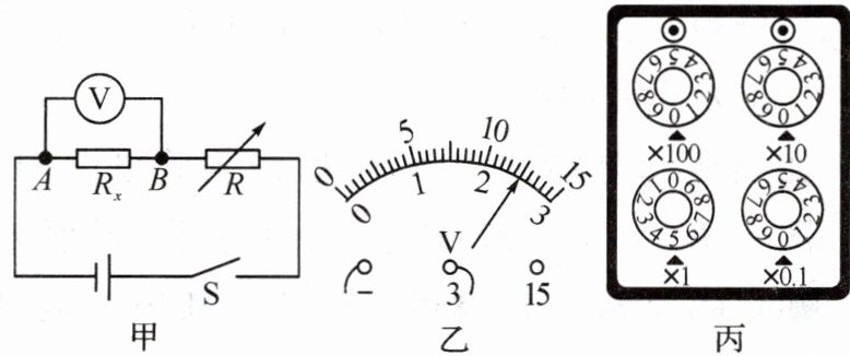 1.(2024·泸州节选)某校物理兴趣小组在课后拓展活动中对一未知电阻进行探究:选用了$3\space V$的电源、待测电阻$R_{x}$、电阻箱、电压表、开关和导线若干。连接了如图甲所示的电路后,调节电阻箱,电压表示数如图乙所示,则电阻箱两端的电压为