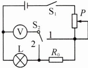 $V$。(2)保持滑片$P$的位置不变,再将开关$S_{2}$拨到触点$1$,读出电压表的示数并记为$U_{2}$。