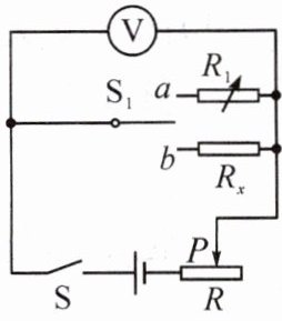 ,移动滑动变阻器$R$的滑片$P$至适当位置,此时电压表的示数为$U$;保持滑片$P$的位置不变,再将开关$S_{1}$拨至另一触点,调节电阻箱$R_{1}$的阻值,使电压表的示数恰好为U