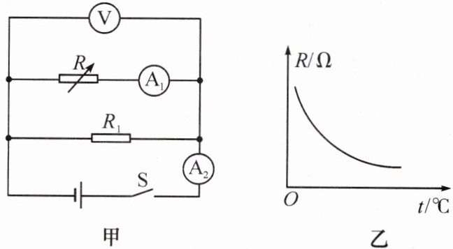 16. 如图甲所示电路。电源电压恒定不变,$ R_{1} $ 是定值电阻,R 是热敏电阻,其阻值 R 与温度 t 的关系如图乙所示。开关 S 闭合,热敏电阻温度升高时,下列说法正确的是 (