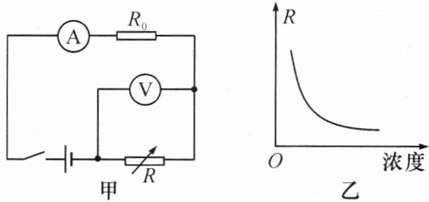 15. 如图甲是大气污染物浓度监测简化电路。当污染物浓度增大时,污染物浓度监测表的示数增大;R 为气敏电阻,其阻值随污染物浓度变化的关系如图乙所示。下列说法正确的是 (
