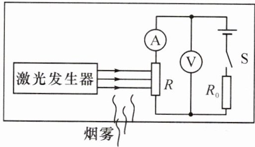 17. (2023·聊城)如图所示,是列车上烟雾报警器的简化原理图。电源电压恒定,$ R_{0} $ 为定值电阻。有烟雾产生时,激光被烟雾遮挡而使光敏电阻的阻值发生变化,当电路中的电流增大至某一数值时报警器开始报警。下列说法中正确的是 (