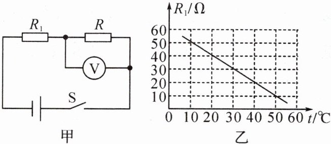 8. 某课外活动小组设计了一个用电压表的变化来反映环境温度变化的电路。如图甲所示, 电源电压不变, 定值电阻 $ R = 20 \, \Omega $, $ R_1 $ 是热敏电阻, 其阻值随温度变化的图像如图乙所示, 闭合开关 $ S $ 后, 求: