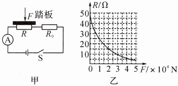 9. (2024·广西)公路部门往往通过地磅检测汽车的载重情况。图甲是跨学科学习团队设计的可视化地磅的电路原理图, 主要由踏板(重力不计)、压力传感器 $ R $、显示承重的仪表(实质为电流表, 量程为 $ 0 \sim 0.6 \, A $)等组成, $ R $ 的阻值与所受压力 $ F $ 大小关系如图乙所示。电源电压为 $ 12 \, V $, 定值电阻 $ R_0 $ 的阻值为 $ 5 \, \Omega $。求: