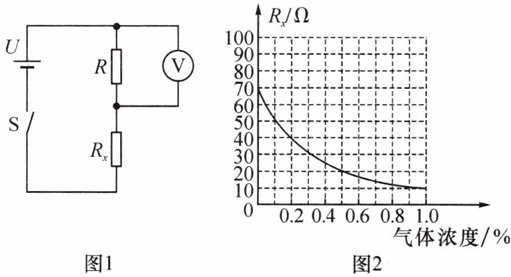7. (2024·镇江)图 1 是小华设计的天然气浓度测试仪, 电源电压 $ U $ 恒为 $ 4 \, V $, $ R $ 为定值电阻, 电压表的量程为 $ 0 \sim 3 \, V $, 将电压表作为气体浓度的显示装置, 要求将电压表示数为 $ 1.5 \, V $ 处标为气体浓度 $ 0.5\% $, 电阻 $ R $ 的阻值应为