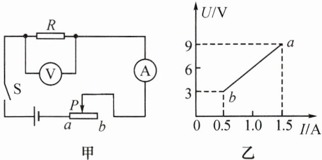 5. 电路如图甲所示,电源电压不变,闭合开关 S 后,滑动变阻器的滑片 P 由 b 端滑到 a 端的过程中,电压表示数 U 与电流表示数 I 的变化关系如图乙所示,则电源电压是