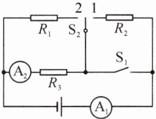 ;当开关$S_{1}$闭合、开关$S_{2}$掷到 2 时,电流表$A_{1}$与电流表$A_{2}$的示数之比为2:1