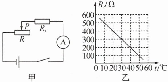7. (多选)(2024·郑州中原区期末)图甲是用热敏电阻测量环境温度的电路图,电源电压恒为$6\ V$,电流表的量程为$0~0.02\ A$,$R_{t}$为热敏电阻,其阻值随环境温度变化的关系如图乙所示,当环境温度为$20\ {^{\circ}C}$时,电流表的读数为$0.01\ A$。下列分析正确的是(