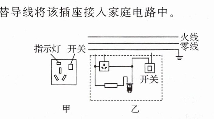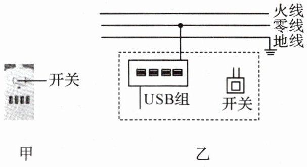 3. 图甲为带开关和USB插口的新款插线板。请用笔画线代替导线将该插线板的开关和USB组正确接入图乙所示的家庭电路。