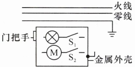6. 如图所示为冰箱工作时的部分电路示意图,冰箱内照明灯由开关$S_{1}$控制,压缩机M由开关$S_{2}$控制,请将冰箱正确接入家庭电路。