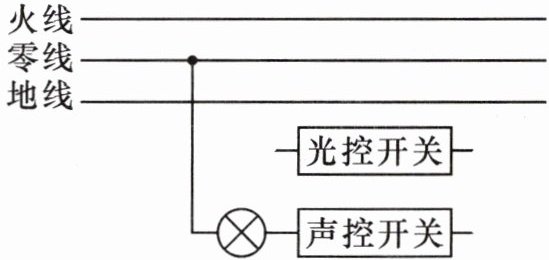4. 如图所示,楼梯处有一电灯受控于两个开关,光线较暗且有声响时灯才亮。其中“光控开关”在光线较暗时自动闭合,“声控开关”在有声响时自动闭合,请用笔画线代替导线把元件连在电路中。