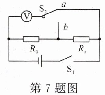 7. (2023·安徽)如图所示的电路中,电阻R₀ = 12 Ω。闭合开关S₁,将单刀双掷开关S₂掷于a端,电压表示数为2.5 V;将S₂切换到b端,电压表示数为1.5 V,则电阻Rₓ的阻值为