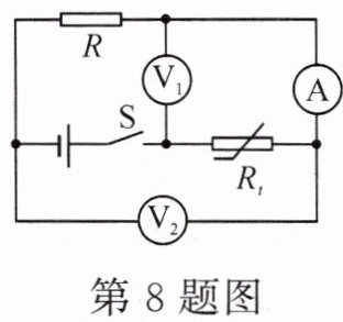 8. (2024·福建)如图所示电路,电源电压保持不变,R为定值电阻,Rₜ为热敏电阻,其阻值随温度的降低而增大。闭合开关S,当热敏电阻Rₜ的温度降低时,电压表V₁的示数