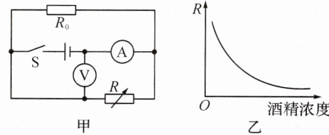 5. (2024·东营改编)图甲是某酒精测试仪的简化电路图,R₀为定值电阻,R为酒精气体传感器,其阻值随酒精浓度变化的图像如图乙所示。若电源电压不变,闭合开关,当R周围酒精浓度增加时,下列判断正确的是(