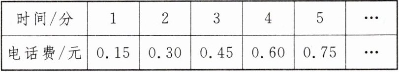 (3)当x=10时,y=0.15×10=1.5.答:国内拨打电话超出10分钟,需多付1.5元电话费.