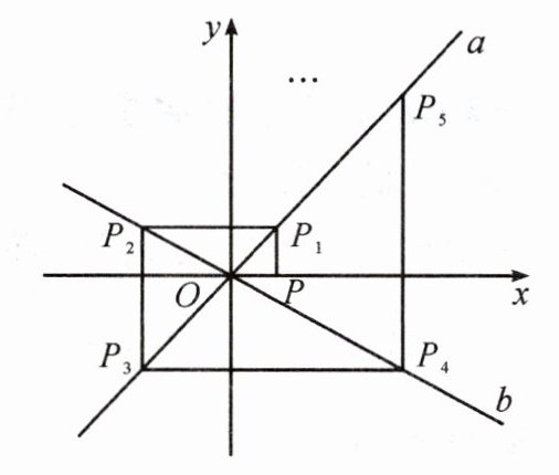 19. 新考向 推理能力 如图,已知直线 $ a: y = x $,直线 $ b: y = -\frac{1}{2}x $ 和点 $ P(1, 0) $,过点 $ P $ 作 $ y $ 轴的平行线交直线 $ a $ 于点 $ P_1 $,过点 $ P_1 $ 作 $ x $ 轴的平行线交直线 $ b $ 于点 $ P_2 $,过点 $ P_2 $ 作 $ y $ 轴的平行线交直线 $ a $ 于点 $ P_3 $,过点 $ P_3 $ 作 $ x $ 轴的平行线交直线 $ b $ 于点 $ P_4 $,……,按此作法进行下去,则点 $ P_{100} $ 的横坐标为