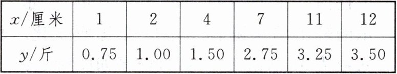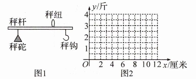7. 新考向 传统文化(2023·蚌埠期末)秤是我国传统的计重工具. 如图 1,可以用秤砣到秤纽的水平距离,来得出秤钩上所挂物体的重量. 称重时,若秤杆上秤砣到秤纽的水平距离为 $ x $(厘米)时,秤钩所挂物重为 $ y $(斤),则 $ y $ 是 $ x $ 的一次函数. 如表中为若干次称重时所记录的一些数据.