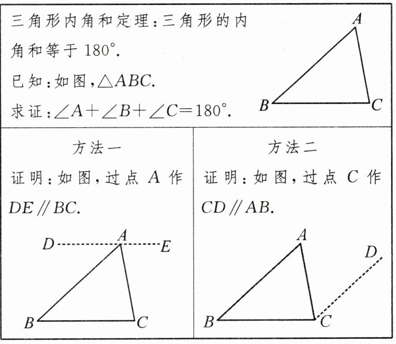 ∴∠B+∠BAC+∠C=180°,即∠A+∠B+∠C=180°.(方法二)