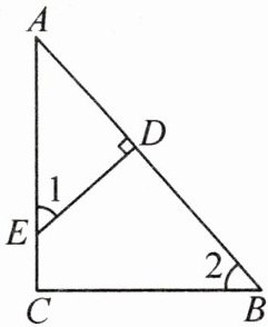 8. (清华附中校本经典题)如图,$ E $ 是 $ \triangle ABC $ 的边 $ AC $ 上的一点,过点 $ E $ 作 $ ED \perp AB $,垂足为 $ D $. 若 $ \angle 1 = \angle 2 $,则 $ \triangle ABC $ 是直角三角形吗?为什么?