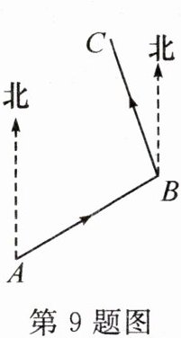 9. 如图,小明从 $A$ 出发沿北偏东 $60^{\circ}$ 方向行走至 $B$ 处,又沿北偏西 $20^{\circ}$ 方向行走至 $C$ 处,此时需把方向调整到与出发时一致,则方向的调整应是右转