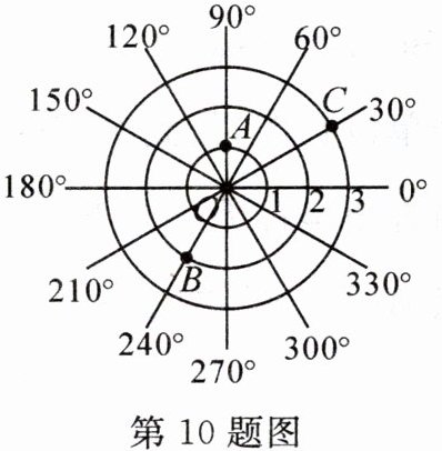 10. (2024·甘孜州)如图,在一个平面区域内,一台雷达探测器测得在点 $A$,$B$,$C$ 处有目标出现. 按某种规则,点 $A$,$B$ 的位置可以分别表示为 $(1,90^{\circ})$,$(2,240^{\circ})$,则点 $C$ 的位置可以表示为