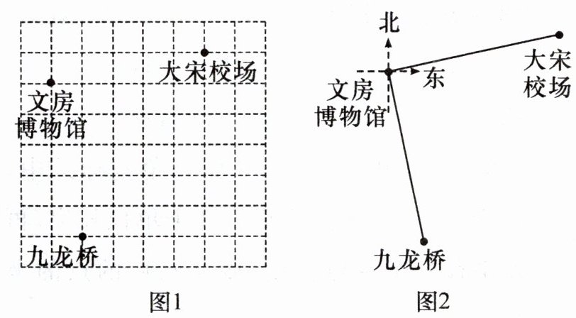 (2)小化同学想到用方位角和距离,如图 2,以文房博物馆为基准点,九龙桥在文房博物馆的南偏东 $11^{\circ}$,距离 7 cm 处. 经过测量,得文房博物馆到大宋校场的距离与到九龙桥的距离相等,请描述大宋校场相对于文房博物馆的位置.