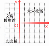 (1)小文同学想到用平面直角坐标系,如图 1,网格中小方格都是边长为 1 个单位长度的正方形. 若文房博物馆的坐标为 $(-2,2)$,九龙桥的坐标为 $(-1,-3)$,请在图 1 中画出平面直角坐标系,并写出大宋校场的坐标;