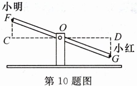 10. 新考向 情境素材 如图,小明与小红玩跷跷板游戏,支点 O 是跷跷板的中点,两人分别坐在跷跷板的两端(即 OF=OG).如果点 O 距地面的距离是 60 cm,那么当小明从水平位置 CD 上升 15 cm 时,小红距地面的高度是