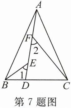 7. (2024·宣城期末)如图,在$\triangle ABC$中,$AB=AC,AB>BC$,点D在边BC上,$CD=2BD$,点E,F在线段AD上,$∠1=∠2=∠BAC$.若$\triangle BDE$的面积为2,$\triangle ABC$的面积为24,则$\triangle CFD$的面积为