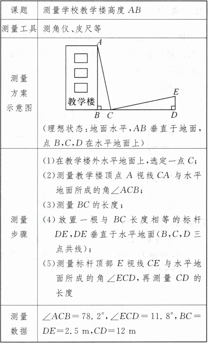 9. (2024·合肥庐江县期末)八年级数学兴趣小组开展了测量学校教学楼高度AB的实践活动,测量方案如下表: