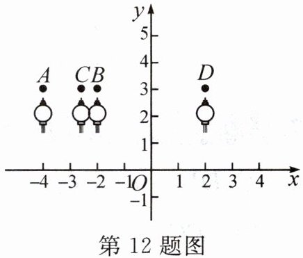 12. 四盏灯笼的位置如图所示。已知点 $ A,C,B,D $ 的坐标分别是 $ (-4,b) $,$ (-2.7,b) $,$ (-2,b) $,$ (2,b) $,平移左侧的一盏灯笼,使得 $ y $ 轴两边的灯笼对称,则平移的方法可以是