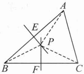 已知:如图,在$\triangle ABC$中,分别作边$AB$,$BC$的垂直平分线,两线相交于点$P$,分别交边$AB$,$BC$于点$E$,$F$.