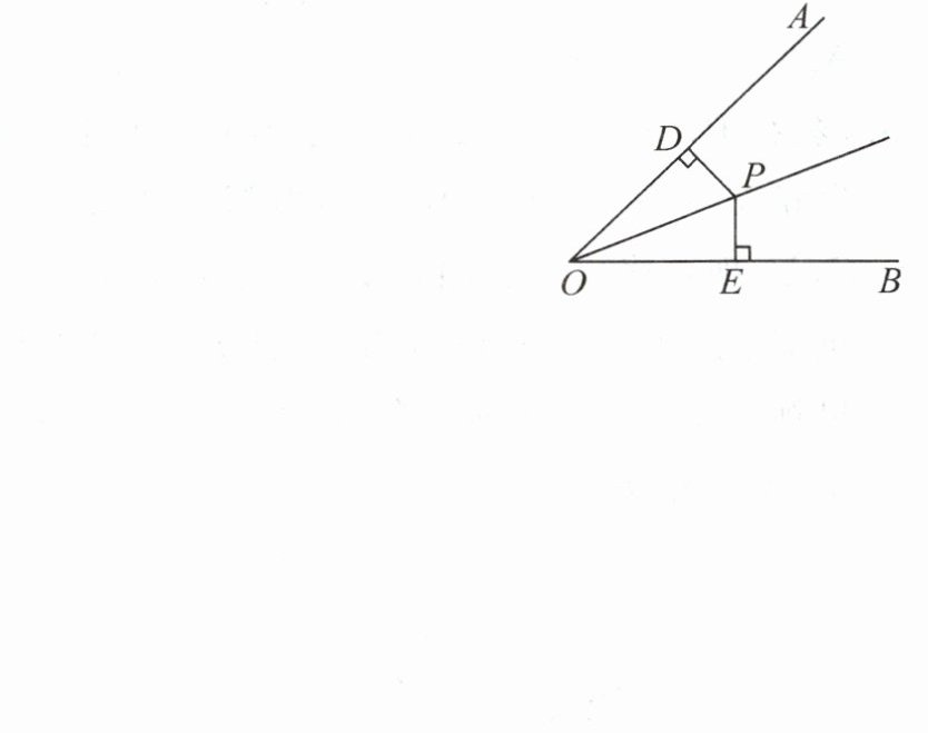 2. 如图,已知$P$为$\angle AOB$内一点,$PD\perp OA$,$PE\perp OB$,垂足分别为$D$,$E$,且$PD = PE$。猜想$\angle AOP$与$\angle BOP$有什么数量关系,试说明理由。