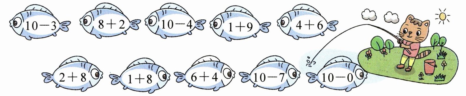 二、小猫钓到了下面得数是 10 的鱼,把它们圈起来。