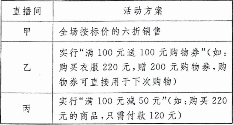 (2)选择甲直播间购买所需费用:0.6×(380+370)=450(元),选择乙直播间购买所需费用:380+370-300=450(元),选择丙直播间购买所需费用:380+370-50×7=400(元)