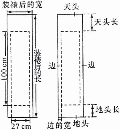 4. 设天头长为$6x$cm,地头长为$4x$cm,则左、右边的宽为$x$cm.根据题意,得$100+(6x + 4x)=4×(27 + 2x)$,解得$x = 4$.$\therefore 6x = 24$.答:边的宽为4cm,天头长为24cm.