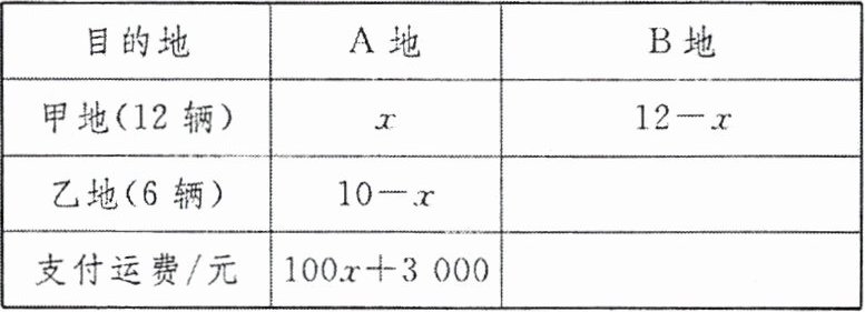 (2)根据题意,得$(100x + 3000)+(7600 - 300x)=9800$,解得$x = 4$.$\therefore 12 - x = 8$,$10 - x = 6$,$x - 4 = 0$.答:从甲地去往A地、B地的卡车分别有4辆、8辆,从乙地去往A地、B地的卡车分别有6辆、0辆.