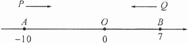 6. 如图,数轴上点 $A$ 和点 $B$ 表示的有理数分别是 -10 和 7,原点为 $O$。现有点 $P$ 从点 $A$ 出发,以 3 个单位长度/秒的速度向右运动,同时点 $Q$ 从点 $B$ 出发,以 2 个单位长度/秒的速度向左运动,经过 $t$ 秒时,点 $P$ 和点 $Q$ 到原点的距离相等,则 $t$ 的值为