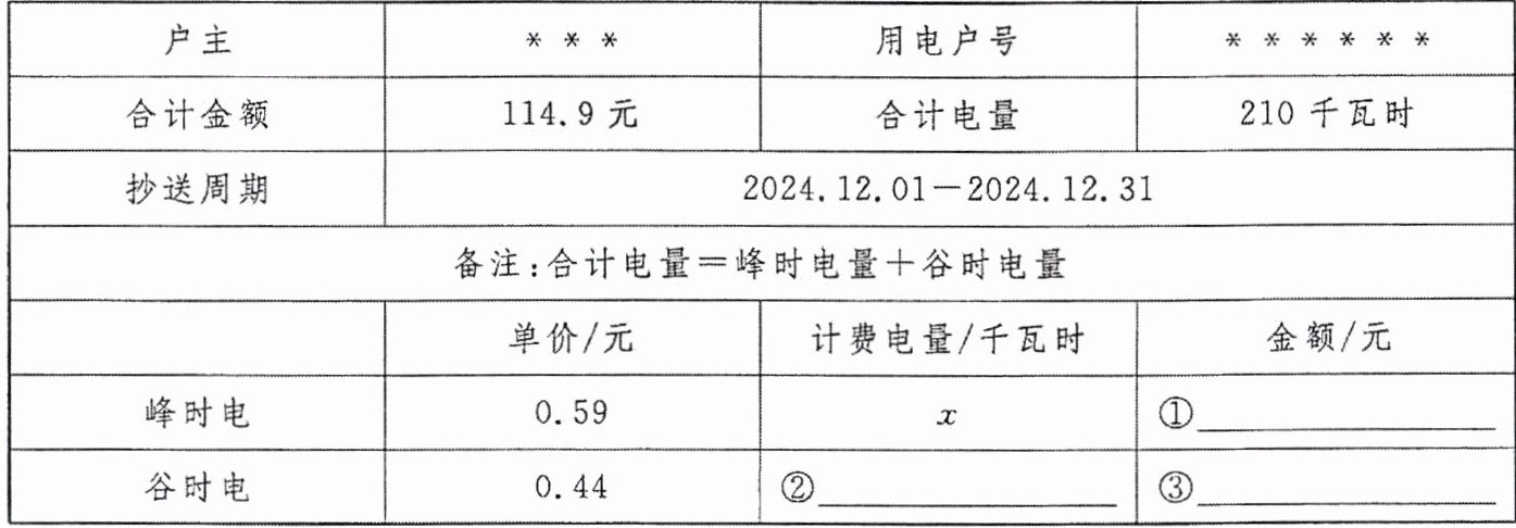 2. 某地为促进电力资源的优化配置,对该地居民用电实施峰谷计费,峰时段为 8:00-22:00;谷时段为 22:00-次日 8:00.下表为该地某户居民 2024 年 12 月份电费账单的部分信息,设其中的峰时电量为 $ x $ 千瓦时.