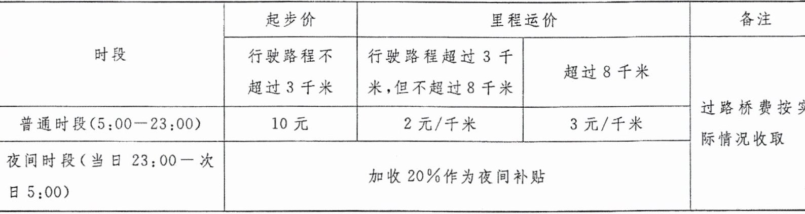 (1)王刚 9:00 乘坐出租车由家去往 A 景区,到达后他向出租车司机支付了 57 元(其中包含 10 元过路桥费,等候费忽略不计),则他家到 A 景区的路程是