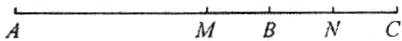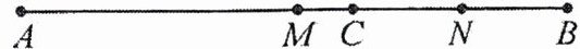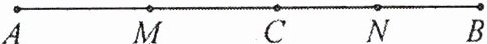 条件:如图,点 $C$ 在线段 $AB$ 所在的直线上,$M$,$N$ 分别是 $AC$,$BC$ 的中点。