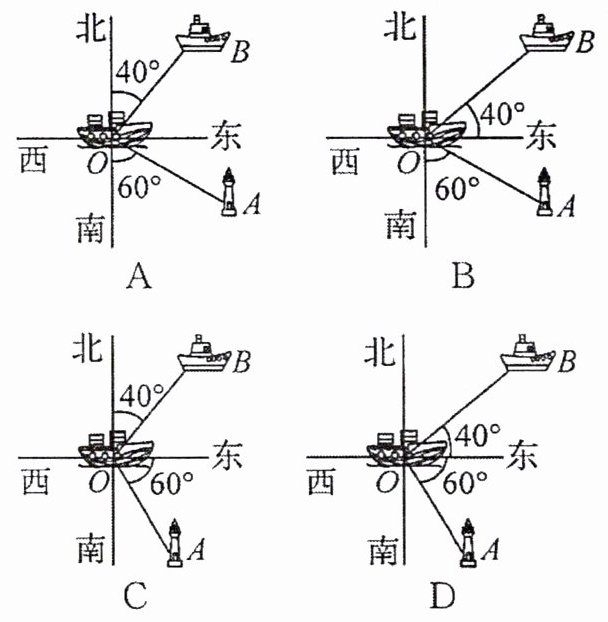 15. 货轮 O 在航行过程中,发现灯塔 A 在它的南偏东 $60^{\circ}$ 方向,同时,在它的北偏东 $40^{\circ}$ 方向上又发现了客轮 B,则下面图形表示正确的是(