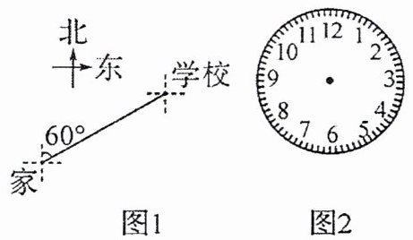 16. 如图 1,小萍从地图上测得学校在她家的北偏东 $60^{\circ}$ 方向,她看到家里的钟表表盘如图 2 所示。若把家的位置看成钟表表盘的中心,则她可以说学校在家的(