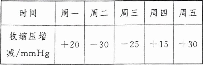 8. 某病人每天下午需要测量血压,该病人上周日收缩压为$120mmHg$.下表是该病人这周每天与前一天相比收缩压的变化情况,则该病人本周五的收缩压是
