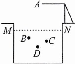 16. 如图,$MN$为一个泳池内的水平面.某跳水运动员(看作一个点)从点$A$处起跳,点$B$,$C$,$D$为他三次跳水后落入水中的位置,已知点$B$与点$D$的高度差是$1.5m$,点$C$与点$A$的高度差是$10.5m$.以水面为基准,在水面上方记为正,下方记为负,点$A$表示的是$+7.5m$,点$B$表示的是$-2m$,则点$B$比点$C$高多少?点$D$比点$A$低多少?