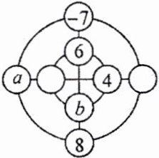 16. 小学时候大家喜欢玩的“幻方”游戏,老师稍加创新改成了“幻圆”游戏.现在将$-1$,$2$,$-3$,$4$,$-5$,$6$,$-7$,$8$分别填入图中的圆圈内,使横、竖以及内、外两圆上的$4$个数字的和都相等.如图,老师已经帮助同学们完成了部分填空,则$a + b$的值为(