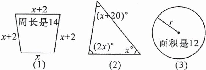 $(1)x+(x+2)+(x+2)+(x+2)=14 (2)x+2x+(x+20)=180 (3)\pi r^{2}=12$